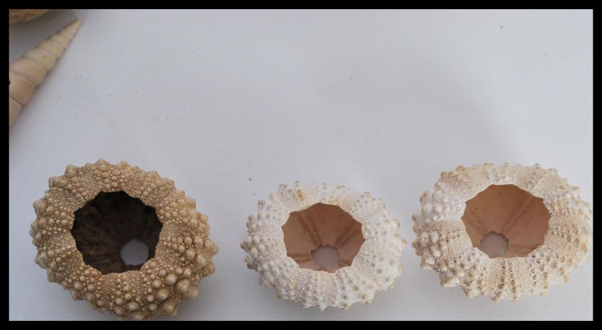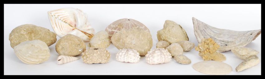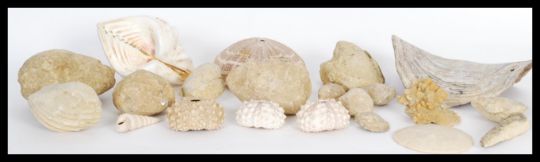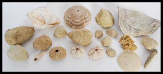 Conchology - A selection of sea shells and fossils to include a sand dollar, cone type shells, dried sea urchins and a large opening shell.  Biggest measures 15cm wide.