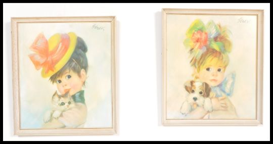Two vintage 1960's /70's retro Strev prints of little girls holding puppies within white frames. Measures: 42cm high x 37cm wide.