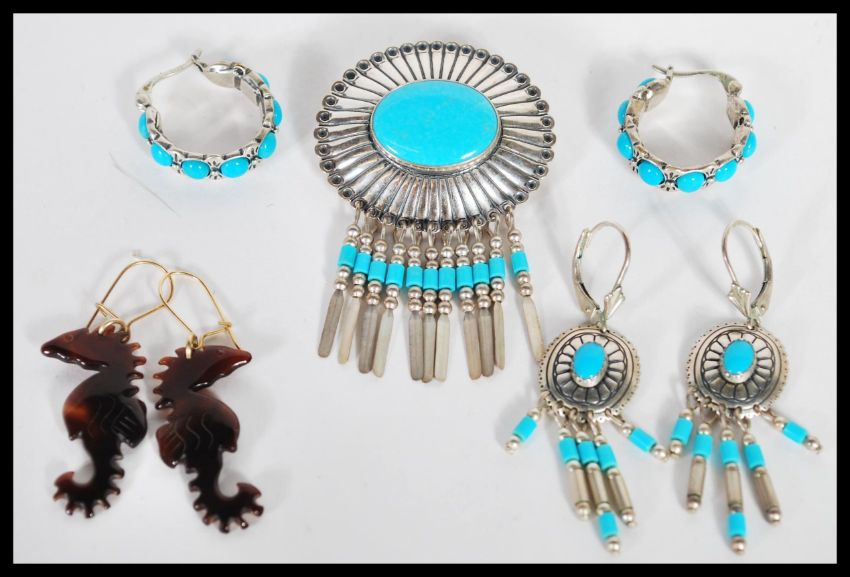 A collection of silver and turquoise stone jewellery to include a pair of hooped earrings set with round turquoise stones, a pair of drop earrings having with oval turquoise cabochons set with silver and turquoise graduation drop chains beneath and a matching brooch, along with a pair of tortoise shell sea horse earrings. Stamped 925. Total weight 19.8g.