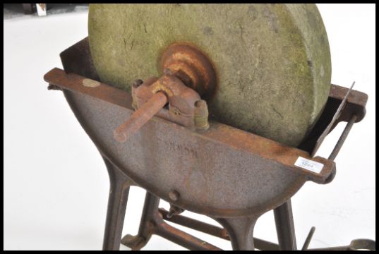 A believed antique stone foot operated sharpening / grinding wheel with cast iron cradle and supports, large stone wheel to centre. Measures: 100cm high x 53cm wide x 25cm deep.