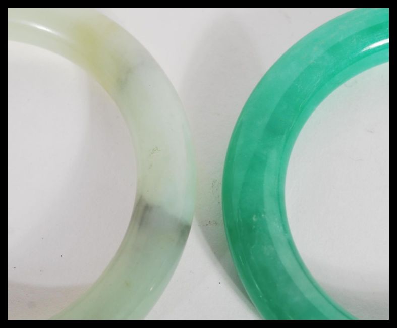 A Chinese rich green  jade bangle / bracelet together with another jade mottled light green bangle, both measuring 8.5cm diameter with a combined weight of 146.5g. Biggest 8.5cm diameter.