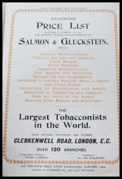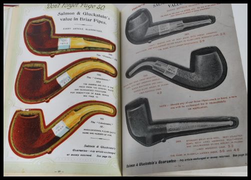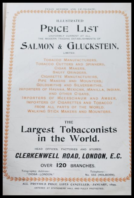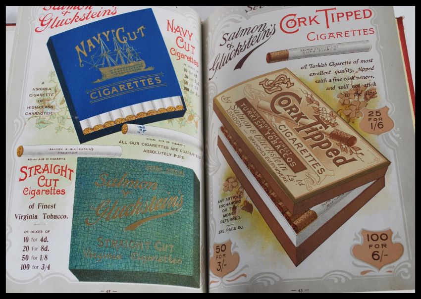 An antique rare Salmon & Gluckstein's ' Illustrated Guide For Smokers ' Price List / catalogue. Likely circa 1910. Fantastically illustrated with ranges of cigarettes, packets and other period items available from the company. One of the most beautiful antique catalogues we've ever seen. Some loose pages, wear to spine. Rare.