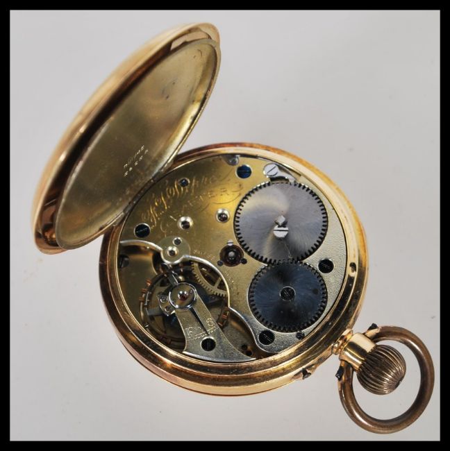 An 18t gold open faced crown winder pocket watch with enamel dial, roman numeral chapter ring with subsidiary dial and faceted hands, signed to the movement Depree of Exeter. Gross weight 98.6g. Face 45mm diameter.