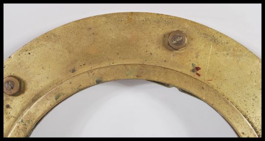 A vintage early 20th Century bronze ships porthole, the porthole mounted to wood with hanging attachments ready for conversion in to a mirror, stamped J & J Woods Ltd. 39cm diameter.