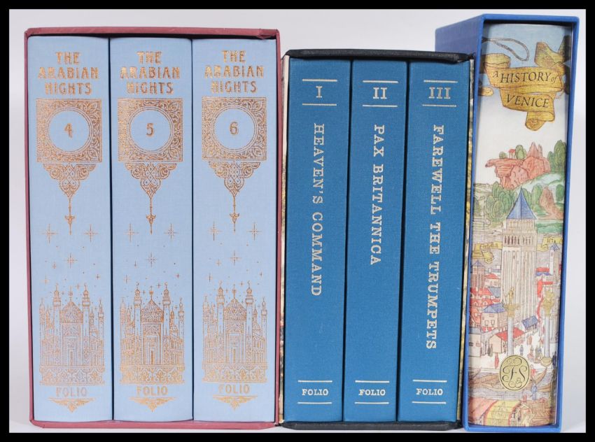 A group of Folio Society book sets / books comprising of 2007 A History Of Venice John Julius Norwich, Arabian Nights Vol 4-6 2003 and Pax Britannica James Morris. All in presentation sleeves. 27cm high tallest.