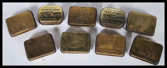 A group of nine vintage 20th Century Gramophone needle cases to include Dymax, Meldon's Stores Ltd, The Companion, Finest Quality Perophone, Leading Always leaping dog example.Hansons, Bell Tower etc.