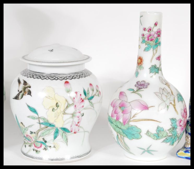A collection of 20th Century Chinese ceramics to include republic period figures, vases, lidded ginger jar, celadon glaze vase with ring handles and a carved wooden figurine of an elder.