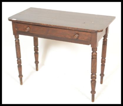 A 19th century Victorian mahogany writing table desk being raised on ring turned uprights. Above a single drawer to the frieze with brass handles, flared  edge desk top above. Measures: 69cm high x 89cm wide x 45cm deep.