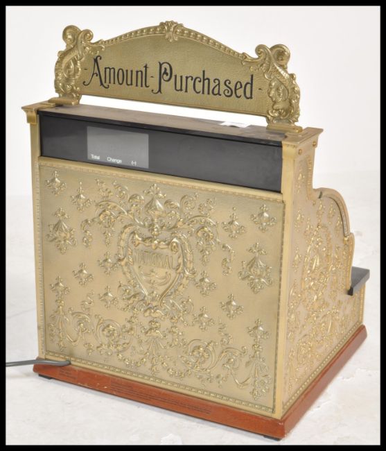 A 20th Century contemporary National shop cash till, the till in the 19th Century style. Gilt body with Amount Purchased name plaque to the top. Measures: 56cm high x 42cm wide x 39cm deep.
