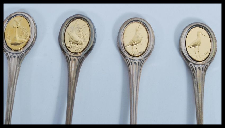 A set of eleven 20th century hallmarked silver commemorative spoons for the Royal Society of birds, designed by John Pinches. Made by the Great Crest London 1975-76. All in there original cases. Gross weight 301g.