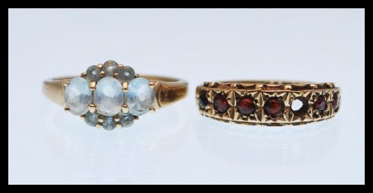 A hallmarked 9ct gold ring set with a cluster of light blue stones (hallmarked London, size N) along with a hallmarked ring set with six red stones (hallmarked Birmingham, size L). Total weight 5.4g.