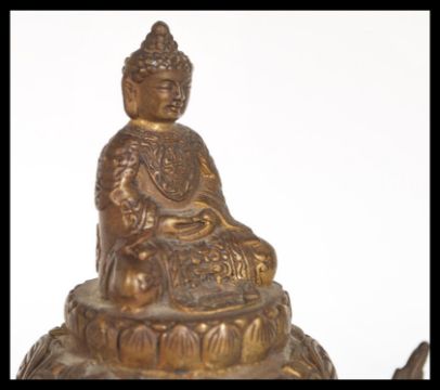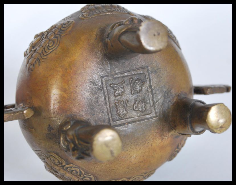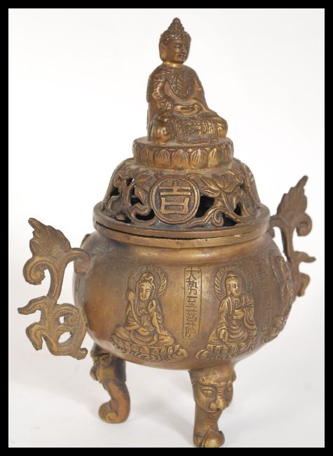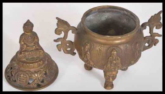 A 19th Century Chinese bronze incense censer ding burner raised on three legs with grotesque masks. Relief decoration to the body depicting Buddhas and calligraphy, The lid having pierced decoration with Buddha finial. Four character marks to base. Measures 16 cm high.