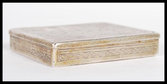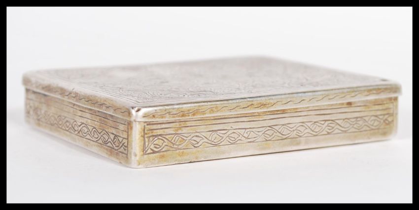 An early 20th Century Islamic silver box having scrolled engraved design. Weighs 115.7 grams. H2cm x W9cm x D8cm.