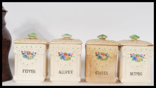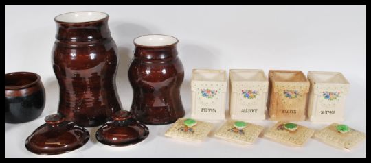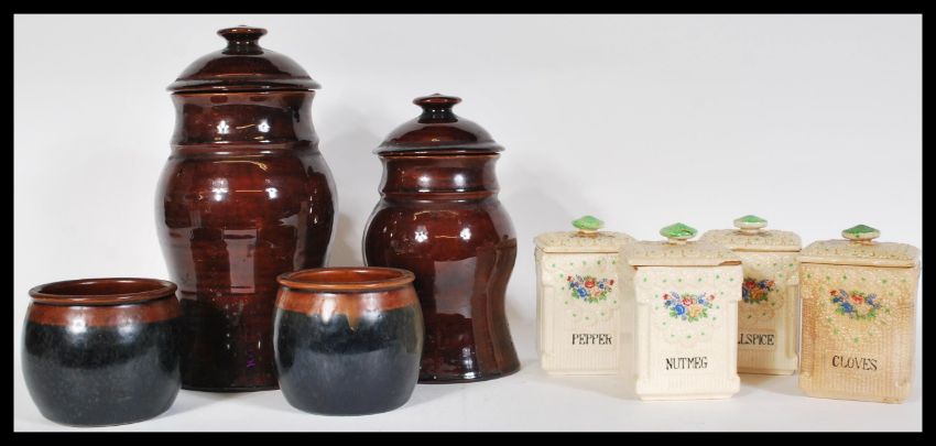 A collection of four early 20th Century Art Deco kitchen spice storage jars, with lids, the jars reading Allspice, Nutmeg, Cloves and Pepper together with a pair of lidded stoneware storage jars. Tallest 25cm high.