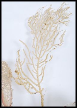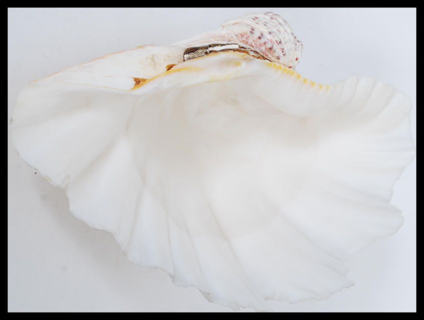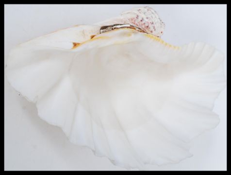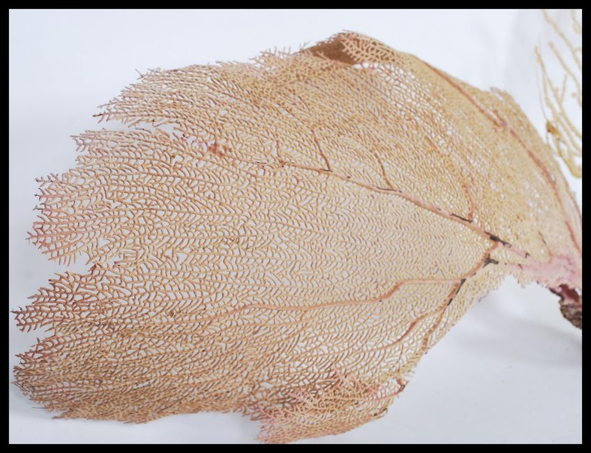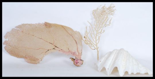 Conchology - A large open bear's paw clam shell having vertical striations and red markings, along with two pieces of fan type coral. Measures approx 29cm wide.