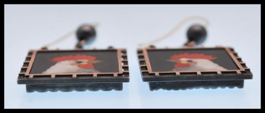 A pair of 19th Century Victorian silver and gold mounted pietra dura mosaic drop earrings of square form depicting hens with pieces of finely cut precious stone. Each panel is suspended from two silver chains with black pearls above. Earrings within a fitted Chilcott & Co box. Metals unmarked. Weight 20.3g. Total length of earrings 56mm, panels measure 26 x 26mm.