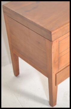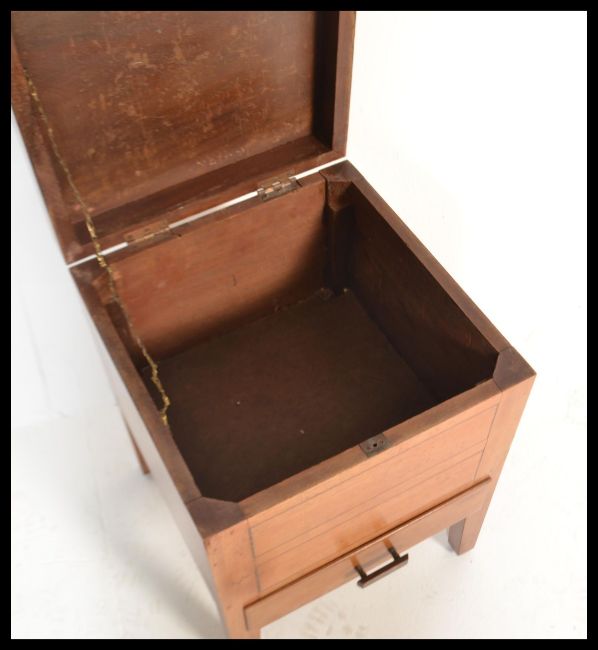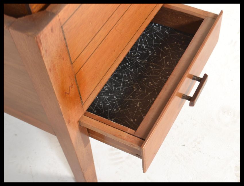 A vintage mid 20th Century wooden workbox / sewing box with fitted lift up lid revealing fitted sectional interior over single drawer raised on stub supports.Measures: 48cm high x 36cm wide x 36cm deep.