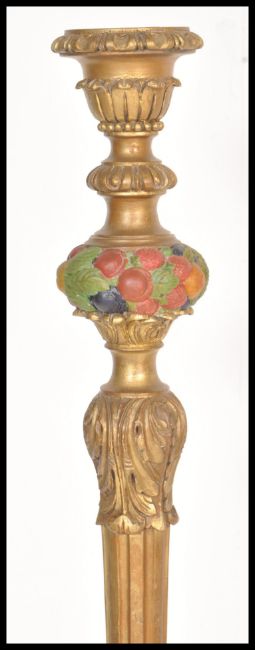 An early 20th Century Edwardian standard lamp raised on scrolled leg with gilt acanthus leaf decoration. The tapering reeded column having rare painted fruit bowl knop to column.