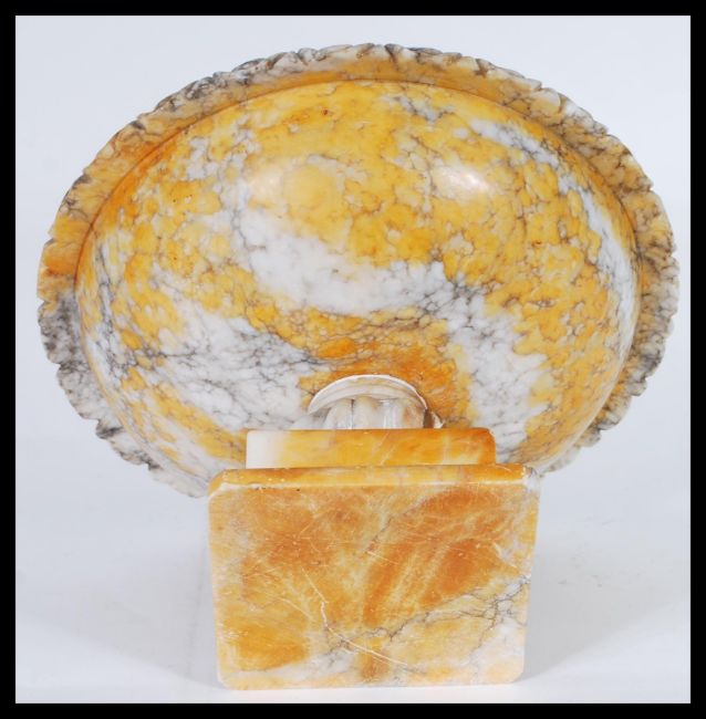 A 19th century Grand Tour alabaster centrepiece bowl / raised tazza adorned with doves to the outer edge and raised on squared terrace base. 20cm high 31cm diameter.