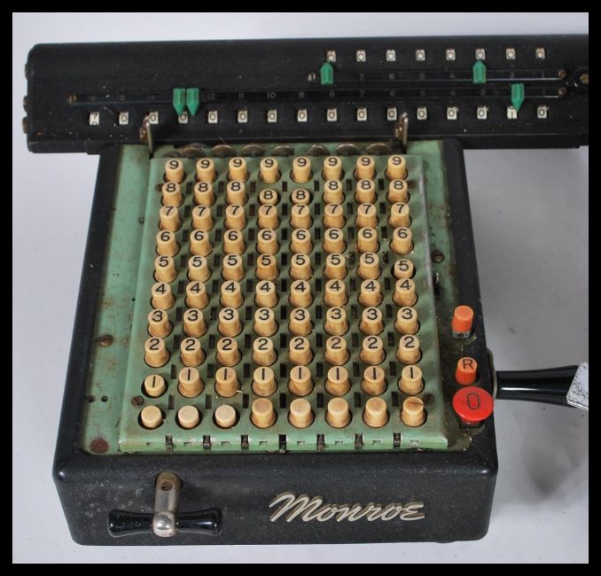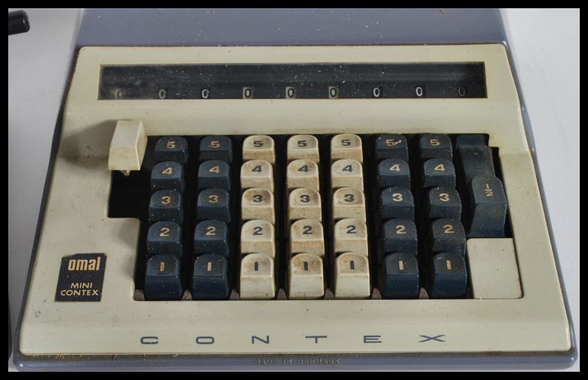 A large collection of vintage adding machines to include: Monroe LX-160 (1950),Facet TK (1948), Contex Model B (1970), Regina AS7 (1960), Boxed Accurator manual adding machine with instructions, Dyal-A-Matic automatic adding Machine (1960's), Magic Brain Calculator (1955). Biggest 15cm high 29cm wide.