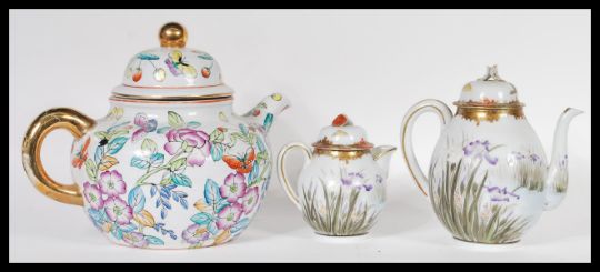 A 20th Century Japanese porcelain coffee pot with hand painted flowers,fauna and butterflies together with a matching water pot, character marks to base together with an oversized Chinese teapot. Tallest measures 26cm high.