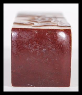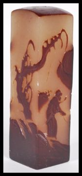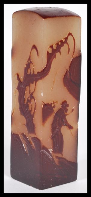 A Chinese soapstone seal carved in relief with a scholar, mountains and fauna,marks to base. 11cm high.