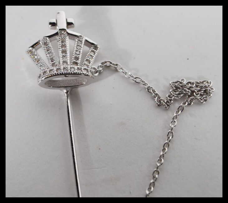 A sterling silver hat pin in the form of a crown decorated with CZ stones. Weighs 4 grams.