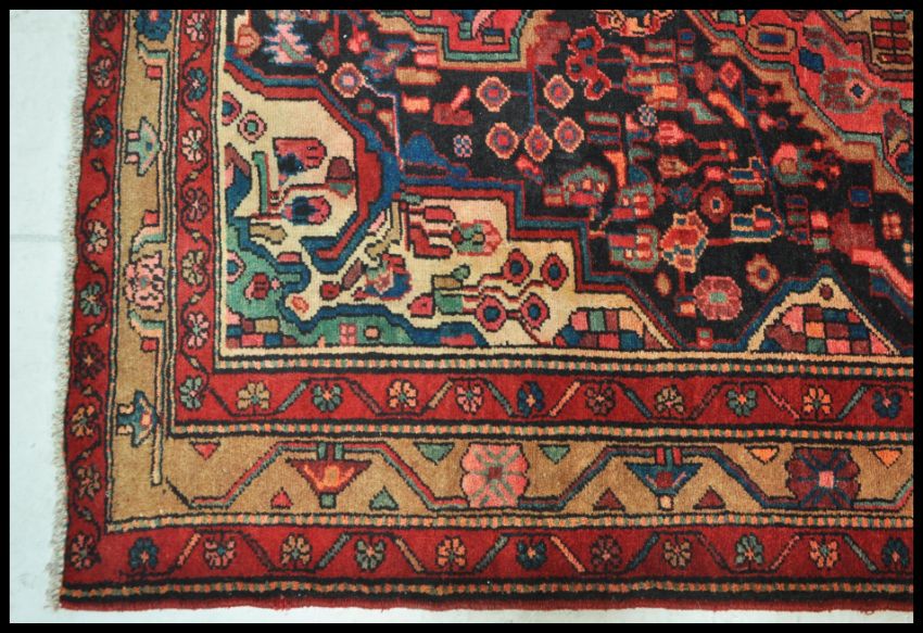 A Persian Islamic Zanjaan hand made wool floor rug / carpet having a red ground with geometric decoration, being professionally cleaned and using natural dye.Measures: 208 cm X 130 cm