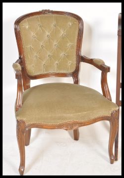 A collection of furniture to include a Victorian mahogany towel rail with slatted centre together with a French green velour mahogany armchair fauteuil and a mahogany butlers trolley with drop leaf sides.
