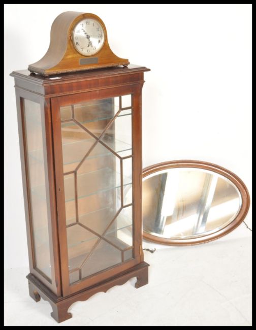 A 1930's dome top mantel clock with silvered dial together with a mahogany oval overmantel mirror and a mahogany pedestal display cabinet. Measures: 108cm high x 53cm wide x 28cm deep.
