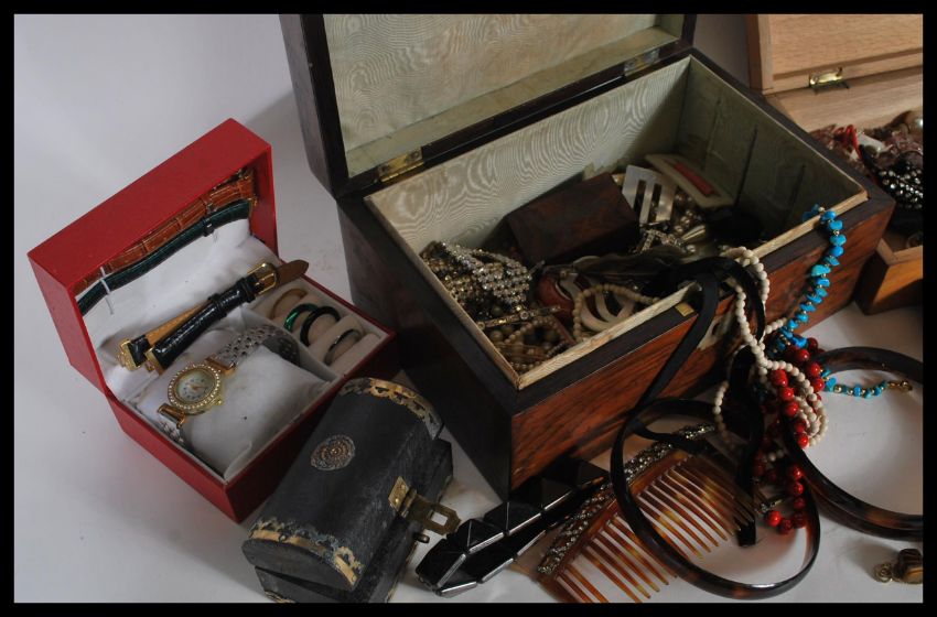 A collection of vintage costume jewellery set within a selection of jewellery boxes to include simulation pearls, leather watch straps, beaded necklaces including turquoise, bangles and bracelets, tortoise shell hair accessories, a Scottish thistle necklace, agate bracelets etc.