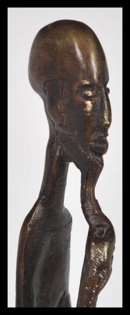 An African tribal bronze figurine of an elongated man stroking his beard raised on square base. 52cm high.