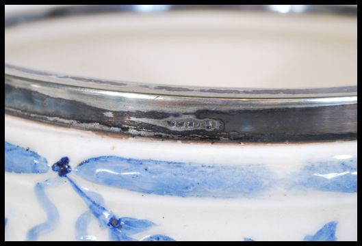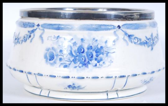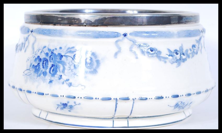A 19th Century Victorian centre bowl with silver plated collar, the blue and white bowl decorated in relief with floral swags, stamped to the baser Royal Bonn. 12cm high 20cm diameter.