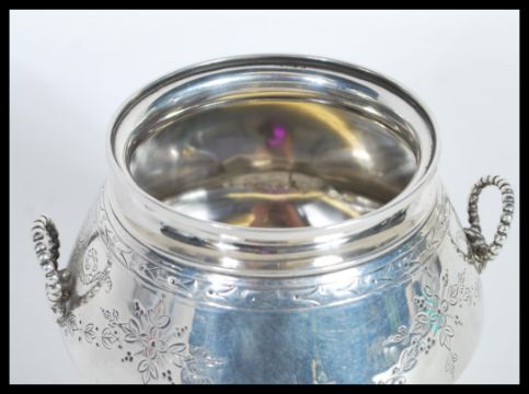 A 19th Century Victorian hallmarked silver two handled bowl by Martin and Hall raised on circular base with small waisted column. Engraved floral and scroll work with rope twist handles. Hallmarked for London 1871. H9cm x W12cm.