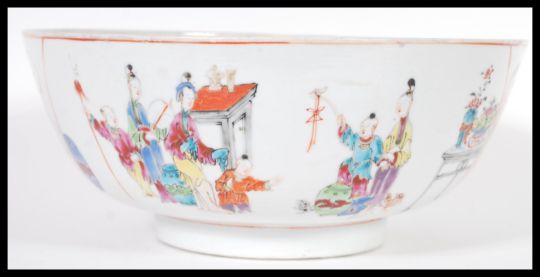 An 18th Century Chinese porcelain bowl having hand painted decoration depicting court scenes with figurines and vases. Raised on a small circular foot with painted floral spray details. Measures 11cm high by 26cm across.