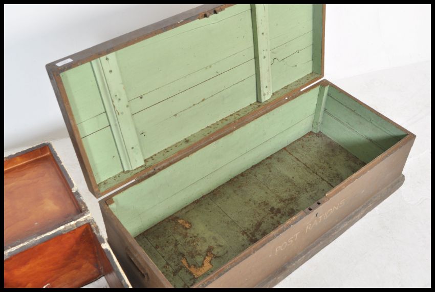 An early 20th century '' Post Rations'' brown wooden trunk having bound hinge top with swing handles to either. Together with a small white storage box. Measures: 30cm high x 97cm wide x 43cm deep.
