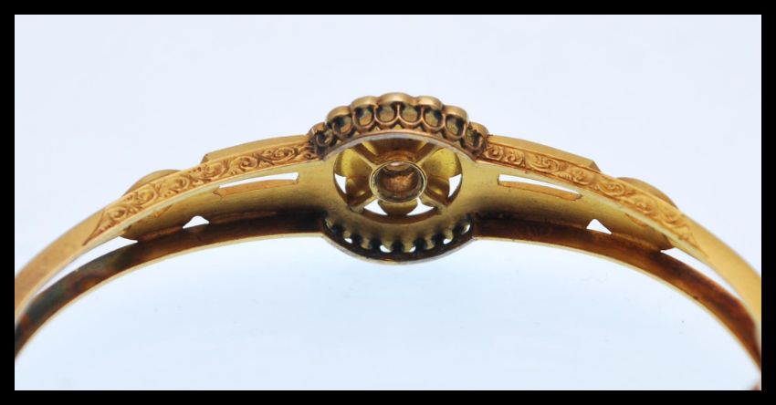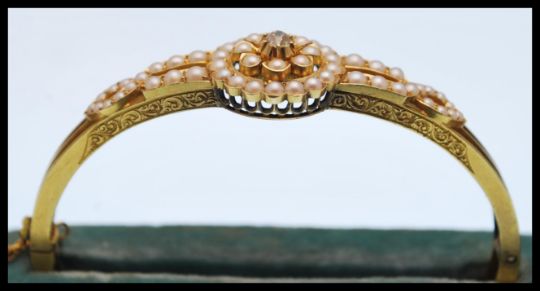 A 19th Century Victorian gold and pearl hinged bangle bracelet set with a central old cut diamond surrounded by two haloes of seed pearls and a further two rows to the shoulders. Complete with safety chain and in a fitted Hunt & Roskell London box. Bracelet unmarked. Measures approx 5.9cm at its widest.
