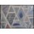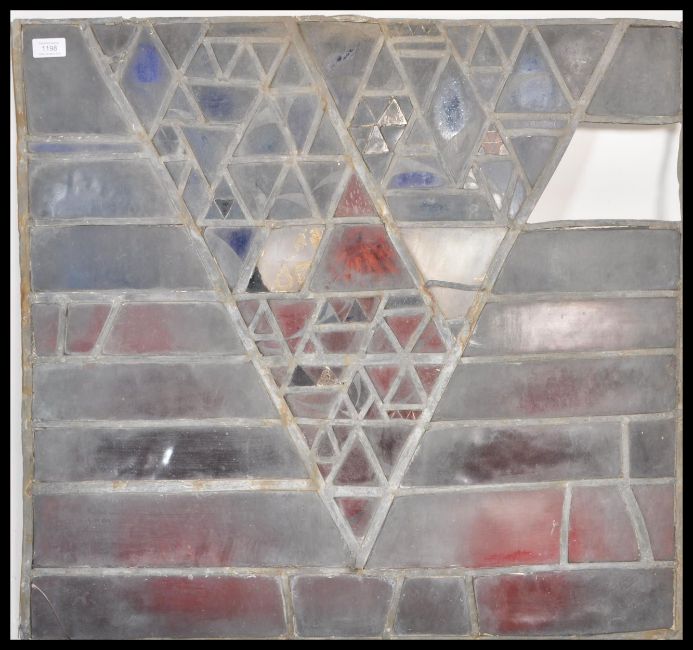 An early 20th Century leaded stain glass window having a geometric triangular design made up of mostly red and blue glass panels. Measures: 73cm high x 79cm deep.