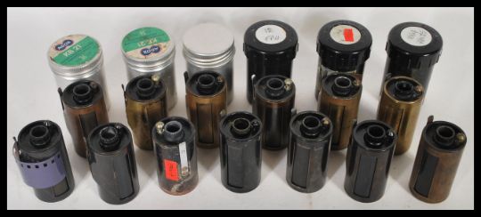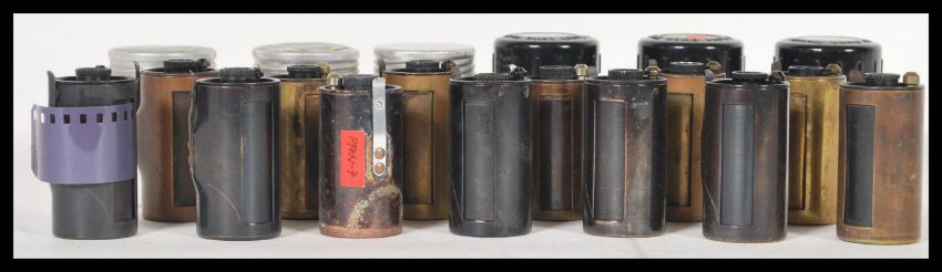 A collection of photographic Leica Leitz Wetzlar reloadable film cassettes, most in containers, 13 in total. Average size 5cm high.