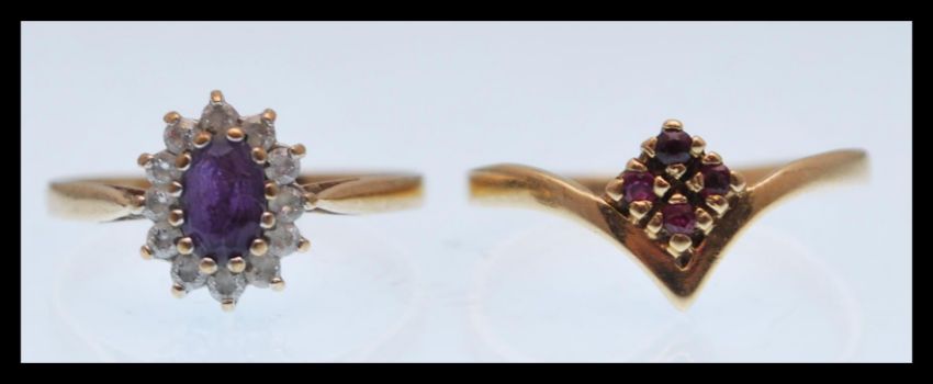 A hallmarked 9ct gold wishbone ring set with four small red stones (hallmarked Birmingham, size Q), along with a hallmarked 9ct gold ring set with an oval purple stone with a halo of white stones (hallmarked Birmingham, size N.5). Total weight 2.8g.