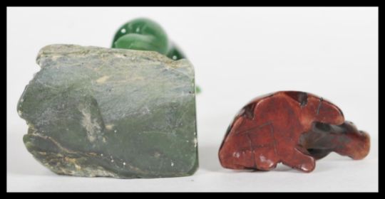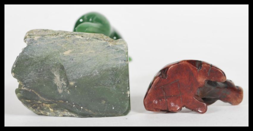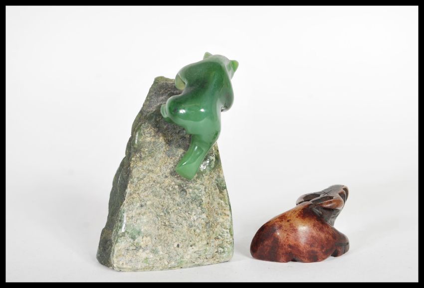 An early 20th Century carved brown jade figurine netsuke in the form of an ox with marks to base along with a Canadian green jade figurine of a polar bear on naturalistic base. Tallest 8cm high.
