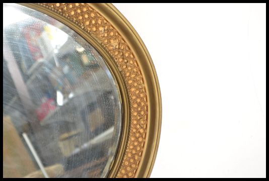 An early 20th Century Edwardian oval wall mirror having bevelled glass having a moulded frame with geometric detailing and beading. Measures: 69cm high x 99cm deep.