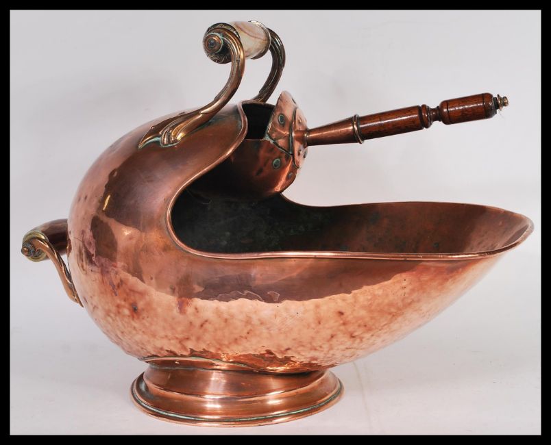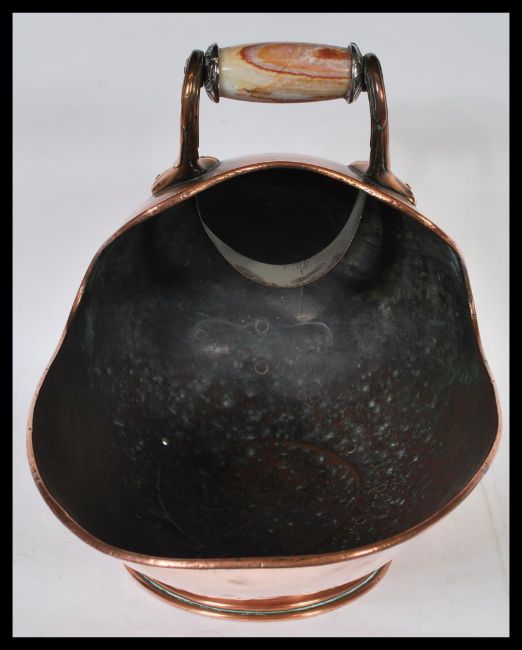 A fantastic 19th Century Victorian Art Nouveau copper coal scuttle having alabaster handle complete with matching coal scoop having turned wooden handle. 39cm high 53cm wide.