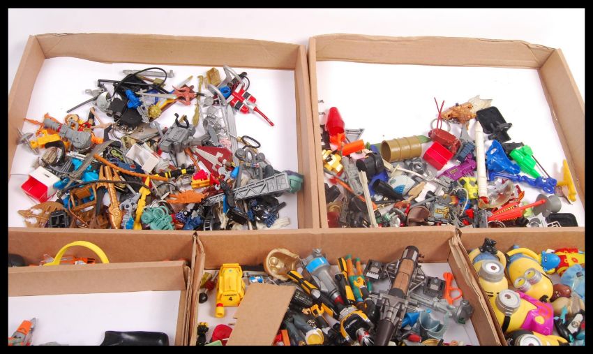 A LARGE collection of assorted action figure accessories and weapons with some action figures throughout. Items relating to; Pirates of The Caribbean, Star Wars, Star Trek, Despicable Me, The Tweenies, Ben 10 and much more.
