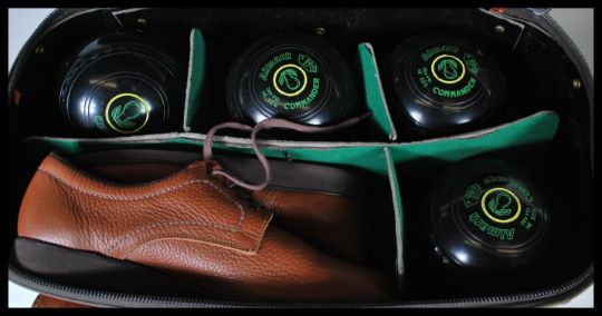 Two sets of vintage Lawn Bowls, one set within the original box and the other in a sports bag with shoes ( size 9 )