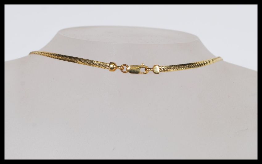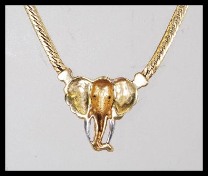 A 9ct gold necklace with a flat link chain attached to a pendant in the form of an elephant. Stamped 375. Weight 13.4g. Chain 46cm long.