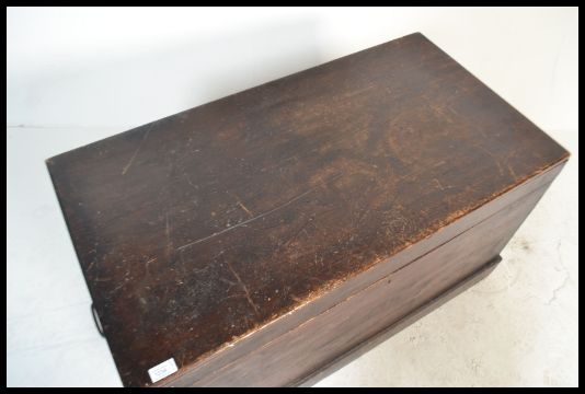 A 19th century Victorian pine blanket box with panelled sides having hinged top with open storage, carry handles to the side raised on plinth base. Measures: 55cm high x 99cm wide x 53cm deep.