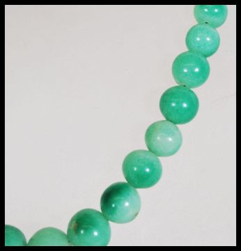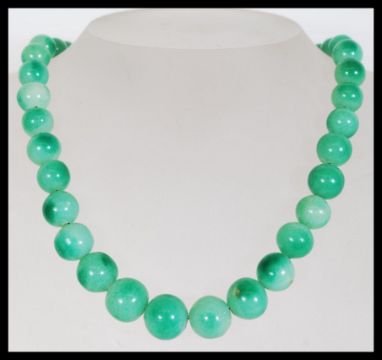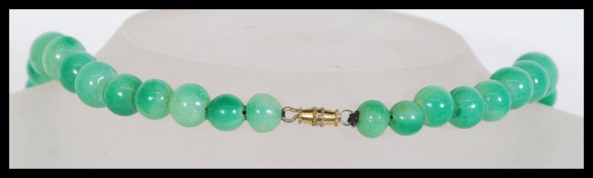 A vintage Chinese believed green jade or Peking glass prayer bead necklace having a graduating set of round beads and barrel clasp along with two carved roundels. Measures 16 inches.