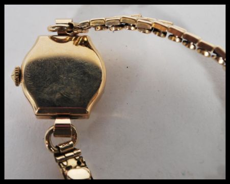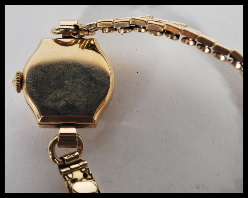 A hallmarked 9ct gold Rotary watch having a champagne dial with gilt numeral chapter ring and faceted hands. Subsidiary dial to six and set to an expanding watch bracelet.