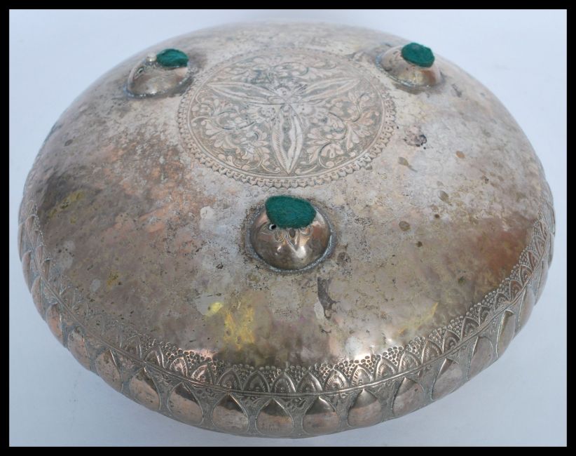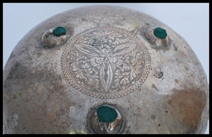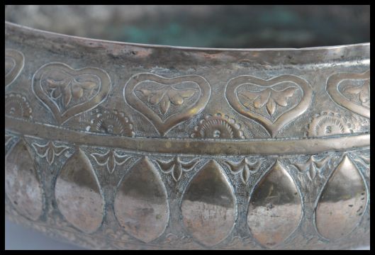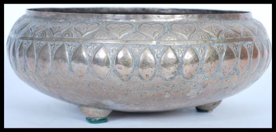 A large 19th Century Middle Eastern Art Nouveau silver rose bowl having embossed in relief with leaf and heart decoration with symbolic medallion to base. Raised on three stub feet. Unmarked but tests as silver. Weight 378g. Measures 11cm high x 28cm diameter.